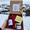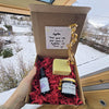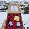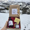 Le tout est présenté dans une boîte kraft, calée dans de la frisure rouge, avec une étiquette écrite à la main, à notre façon.